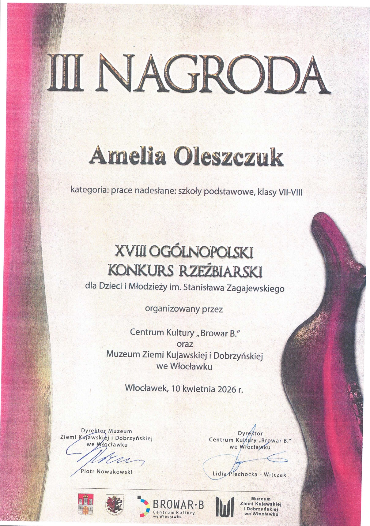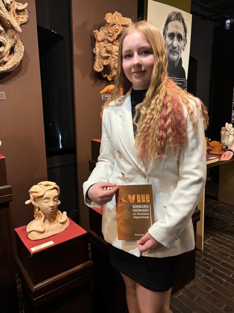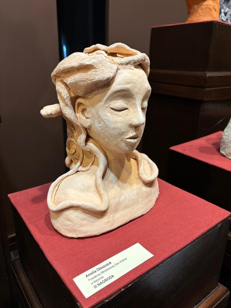 Amelia Oleszczuk wychowanka PMDK w Będzinie, od wielu lat uczęszczająca na zajęcia z ceramiki. Laureatka Konkursów rzeźbiarskich. W tym roku sukces i III miejsce w Ogólnopolskim Konkursie rzeźbiarskim im. Stanisława Zagajewskiego, w poprzednich latach 2024 I miejsce, a w roku 2023 wyróżnienie w tymże konkursie.