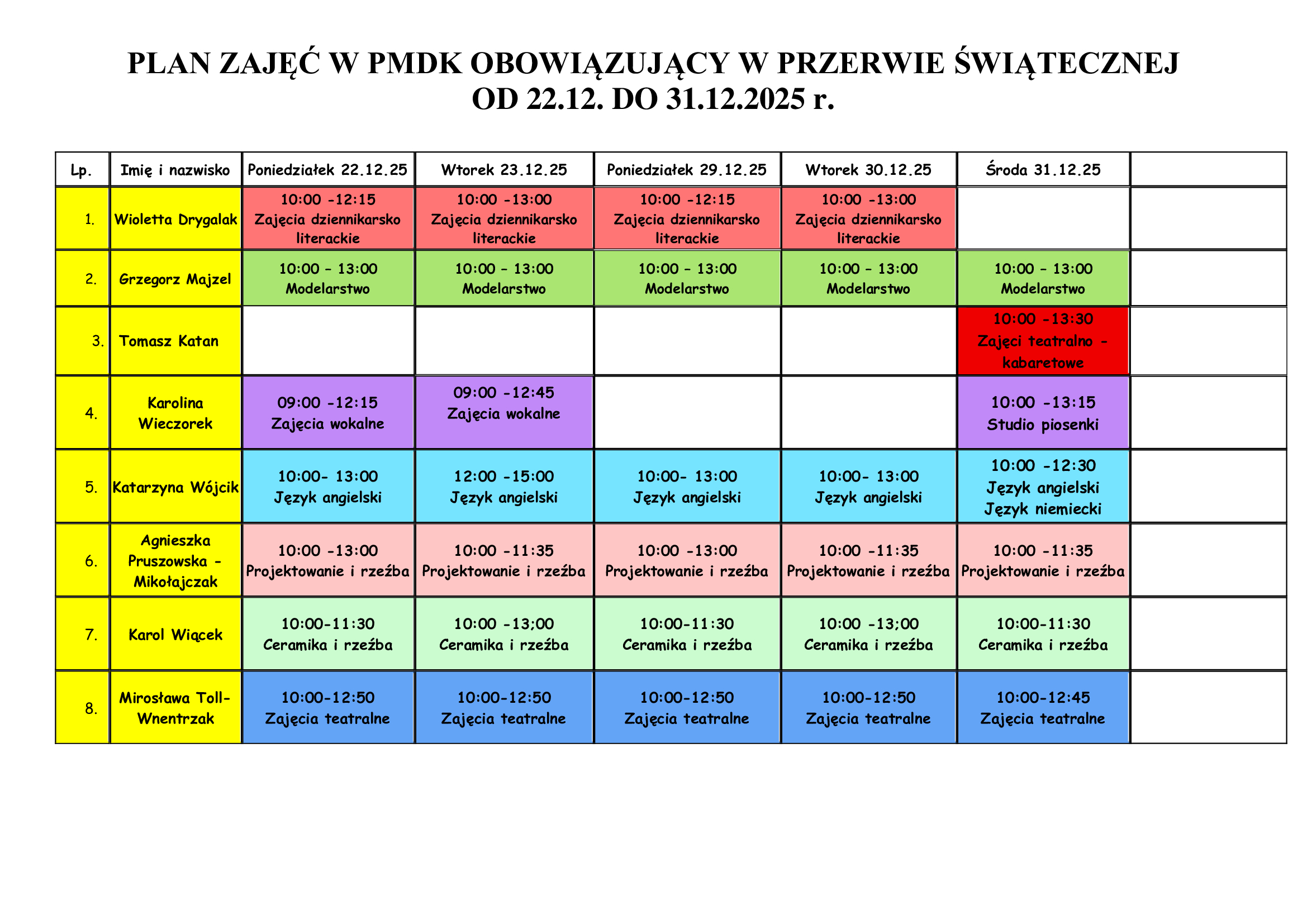 Plan zajęć obowiązujący w przerwie świątecznej od 22.12 .do 31.12.2025 r.
